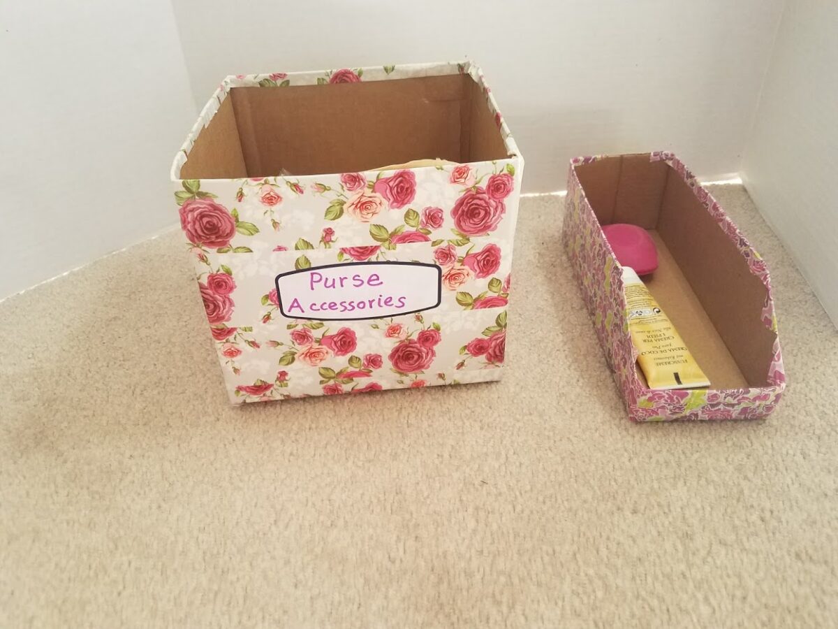I just started wrapping the box starting from the top. The bottom of the boxes weren’t done since no one would see them, but you could decorate them. Here they are with the pretty rose duct tape and purple floral tape I had bought. I love anything pink or with roses on it! The odd shaped box is from Aldi. My nightstand has a narrow drawer that is hard to store things in. I knew this box would be the perfect size! A wider washi tape was used, but you can use any size. I keep my lotion and earbuds in them. The labels came from The Dollar Tree.