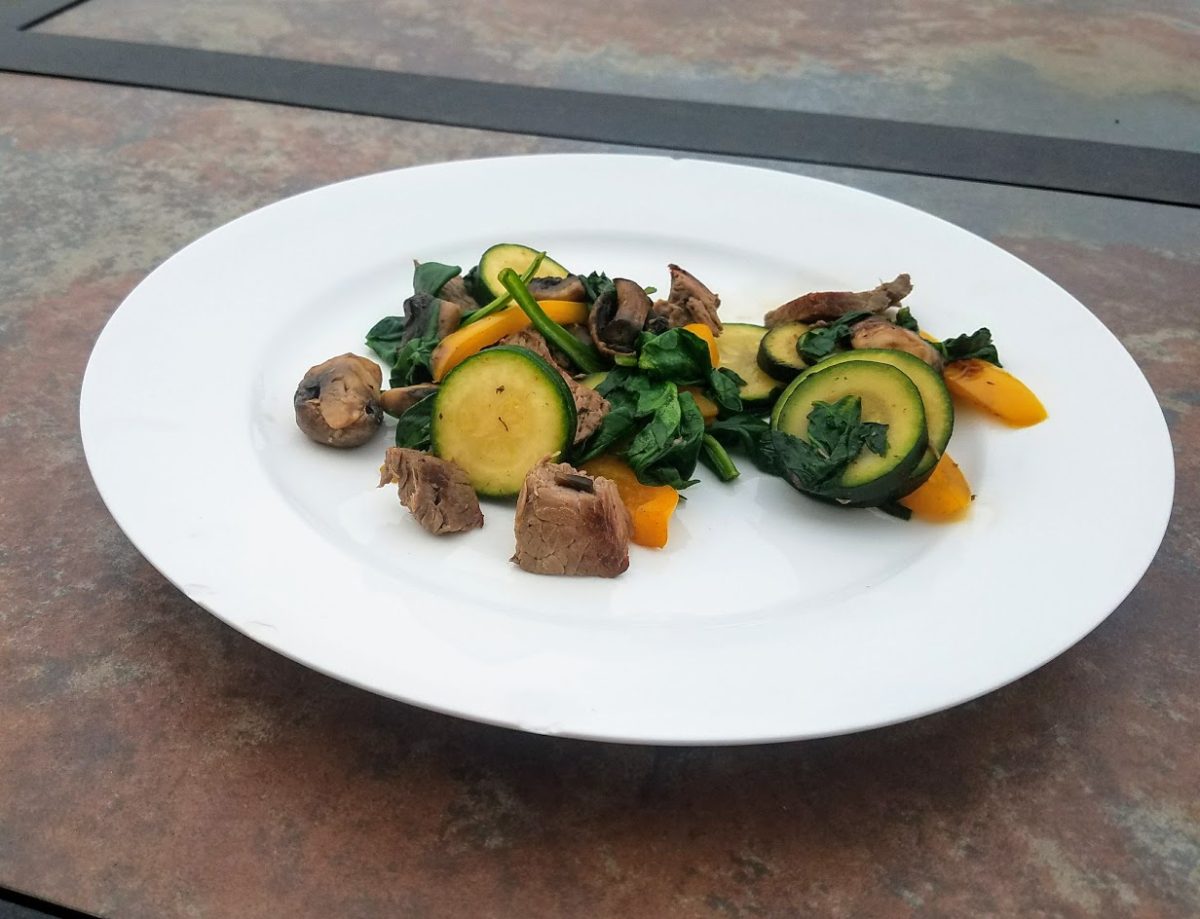 Wash zucchini, peppers, spinach, and mushrooms well. Shred and wash spinach well. Chop up the zucchini in thin slices. Chop peppers in thin to medium slices as well. Slice mushrooms into quarters. Slice leftover steak into medium pieces. Add the avocado oil (or whichever oil you’re using) to a warm, large frying pan. Heat for about 30 seconds.